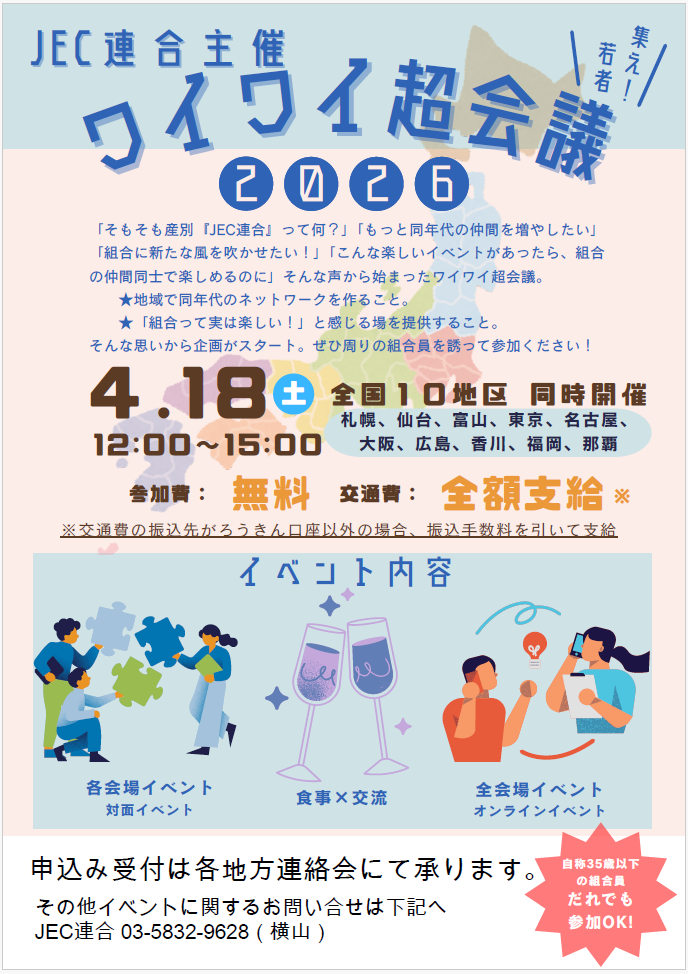 来る2026年4月18日(土)、JEC連合では、「ワイワイ超会議」と題しまして、若手交流イベントを開催いたします。