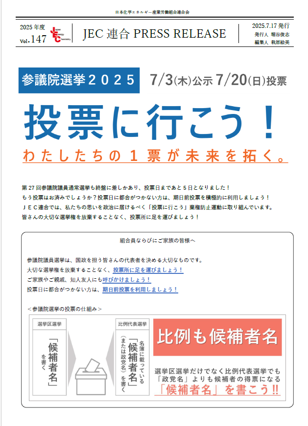 JEC連合 PRESS RELEASE vol.147 参議院選挙2025 投票に行こう!~わたしたちの1票が未来を拓く~<第3報>