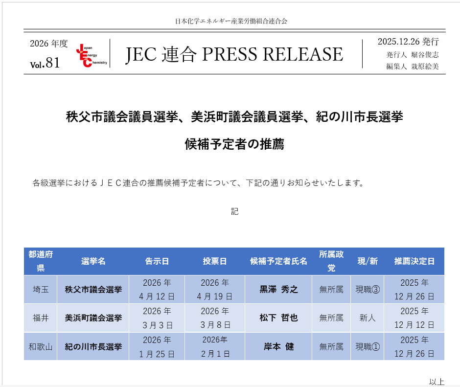 JEC連合PRESSRELEASE vol.81(秩父市議会、美浜町議会、紀の川市長選挙 推薦決定).pdf