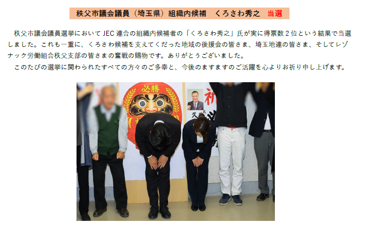 JEC連合PRESS RELEASE vol.145 秩父市議会議員選挙 、栃木市議会議員選挙、藤枝市議会議員選挙 選挙結果
